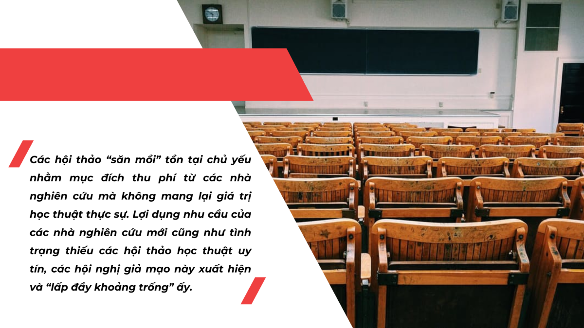Ngược lại, các hội thảo “săn mồi” tồn tại chủ yếu nhằm mục đích thu phí từ các nhà nghiên cứu mà không mang lại giá trị học thuật thực sự. Lợi dụng nhu cầu của các nhà nghiên cứu mới cũng như tình trạng thiếu các hội thảo học thuật uy tín, các hội nghị giả mạo này xuất hiện và “lấp đầy khoảng trống”. Theo đó, các tác giả bị dụ dỗ trình bày tại các hội nghị được tổ chức ở các địa điểm quốc tế, sau đó thu phí hội nghị để xuất bản bài trình bày của tác giả như thỏa thuận. Phóng viên của tạp chí Nature đã tham dự một số hội nghị như vậy ở London (Anh) từ tháng 3 đến tháng 7/2024. Trong một số trường hợp, cả nội dung học thuật và chất lượng tổ chức đều không đạt yêu cầu mà các đại biểu đã kỳ vọng. Ở những trường hợp khác, hội nghị được tổ chức tốt hơn nhưng vẫn có các bài thuyết trình không thông qua quá trình bình duyệt. Thường thì những người bị trục lợi bởi các sự kiện này là các nhà nghiên cứu mới vào nghề và không phải là người nói tiếng Anh bản ngữ.