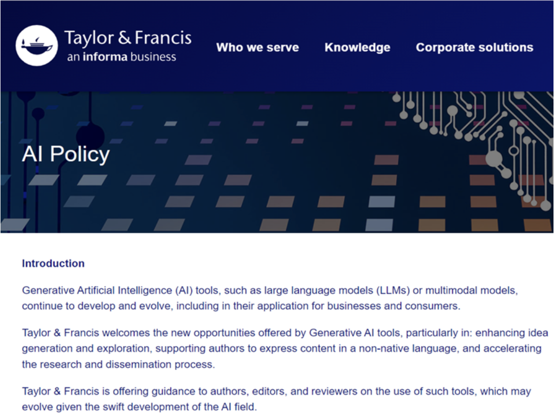 Ảnh: Ảnh chụp màn hình chính sách về sử dụng AI của Nhà xuất bản Taylor & Francis