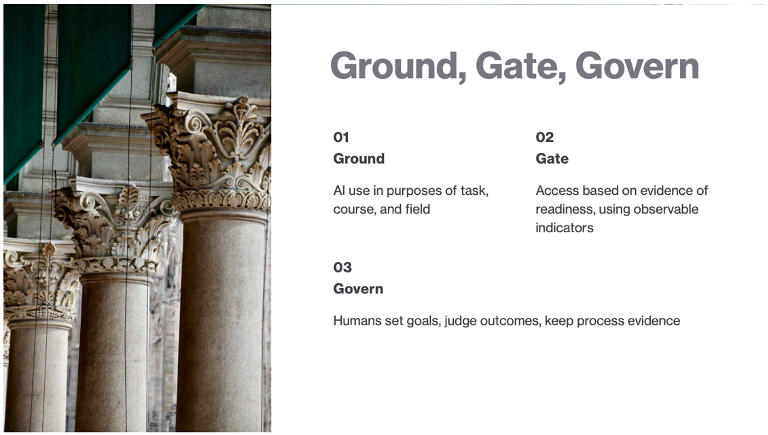 TS. James Diamond: Tôi đề xuất cách tiếp cận “tăng cường có hiệu chỉnh” (calibrated augmentation) – nghĩa là để AI nâng đỡ tư duy người học đúng lúc, đúng chỗ, đúng mức độ. Cách tiếp cận này dựa trên những lập luận lý luận sâu sắc, từ lời kêu gọi của Doug Engelbart về “tăng cường trí tuệ con người” cho đến các công trình của Gavriel Salomon và David Perkins về “công cụ như những đối tác trong tư duy”. Một công cụ tốt không chỉ hỗ trợ nhiệm vụ trước mắt mà còn để lại “dư âm năng lực” khi nó được gác sang một bên. Để làm được điều này, ta cần trì hoãn sự can thiệp của AI cho tới khi người học đã tự lập kế hoạch và tự giải thích mà không có trợ giúp, đồng thời xác định mức độ sẵn sàng dựa trên bằng chứng cụ thể. Ba bước kiểm tra gồm: tự diễn đạt lại vấn đề, tự giải thích chiến lược trong 60–90 giây, và ghi chú giám sát của người học. Trên cơ sở đó, mô hình Ground – Gate – Govern giúp cụ thể hóa thành hành động: Ground xác định mục đích, Gate kiểm soát tiếp cận dựa trên minh chứng, và Govern đảm bảo phán đoán của con người luôn hiện diện.