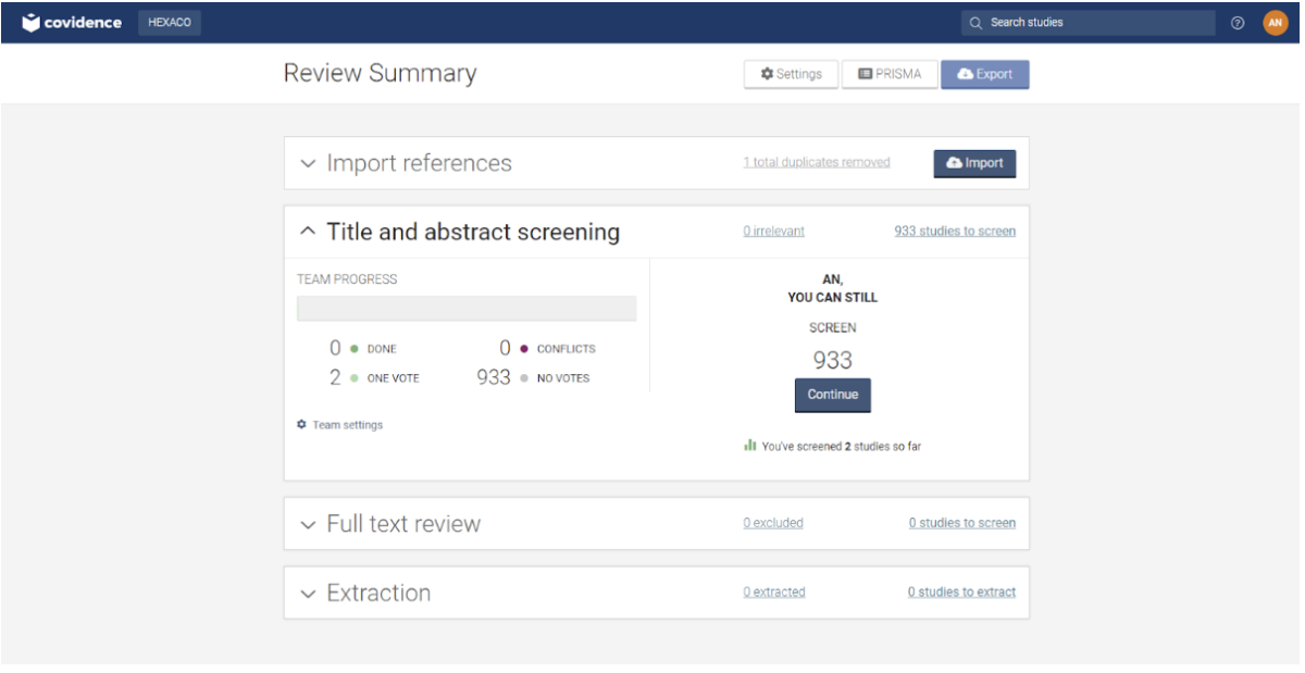 Giao diện của Covidence được thiết kế theo từng bước cụ thể của một quy trình làm tổng quan nghiên cứu (Hình 1). Phần mềm này cũng cho phép các nhà nghiên cứu mời bất kỳ ai tham gia vào dự án của họ mà không cần phải đăng ký sử dụng phần mềm.