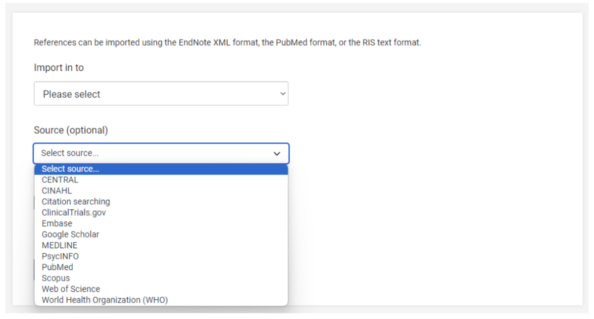 Covidence cho phép người sử dụng tải lên các tệp tài liệu với nhiều nguồn phổ biến như Scopus, WoS, PsycINFO… dưới định dạng EndNote XML, PubMed, hoặc .RIS (Hình 2). Sau khi dữ liệu đã được tải lên thành công, phần mềm này sẽ thông báo số lượng bài báo bị trùng lặp được tìm thấy. Chức năng này giúp nhà nghiên cứu thoải mái tìm dữ liệu từ nhiều nguồn khác nhau để tạo nên một tập hợp dữ liệu lớn mà không cần lo lắng về vấn đề bị trùng lặp.