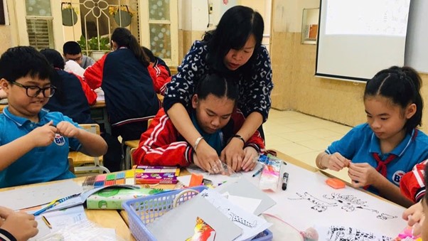 Cô và trò Trường TH Bình Minh (Hà Nội) một trong những cơ sở dạy học sinh tiểu học và học sinh khuyết tật trí tuệ học hòa nhập tại Hà Nội (Ảnh: Trường TH Bình Minh)