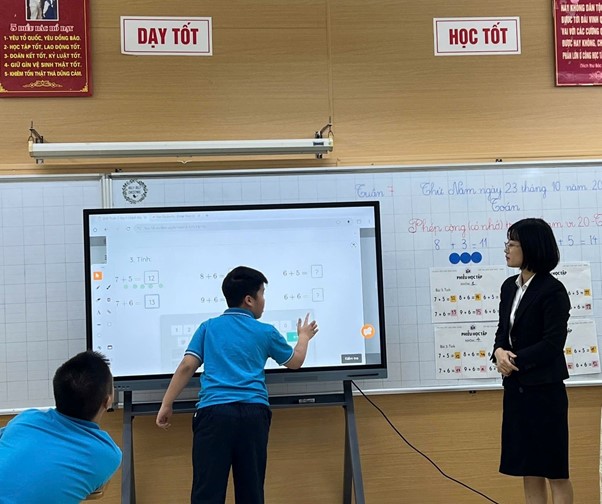 Trong các tiết Khoa học được tổ chức theo hướng trải nghiệm khi học sinh làm việc nhóm, thảo luận mở, được hỗ trợ phù hợp với đặc điểm từng em. Không khí lớp học hòa đồng, tôn trọng khác biệt, thể hiện tinh thần “chạm tới từng học sinh” - giá trị cốt lõi của giáo dục hòa nhập. Với môn Toán, giáo viên sử dụng bảng tương tác, trò chơi trực tuyến và iPad vào bài “Phép cộng có nhớ”, giúp học sinh khuyết tật trí tuệ tham gia dễ dàng hơn. Bài học được điều chỉnh theo kế hoạch giáo dục cá nhân (IEP), cho phép các em thao tác trực tiếp, tăng hứng thú và sự tự tin.
