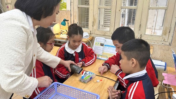 Cô giáo Thanh Ngân, Trường TH Bình Minh (Hà Nội) trong tiết học Khoa học “Năng lượng mặt trời, năng lượng gió và năng lượng nước chảy” (Ảnh: Trường TH Bình Minh)